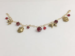 14k gold filled bracelet with goldtone pewter charms and red accent beads