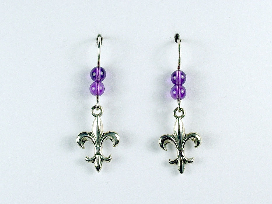 This is a beautiful pair of sterling silver fleur-de-lis earrings. These are approx. 1 1/2 inch long. They have 2 4mm amethyst beads on the sterling silver earwire. All of the metal on this pair is sterling silver. Made in the USA.