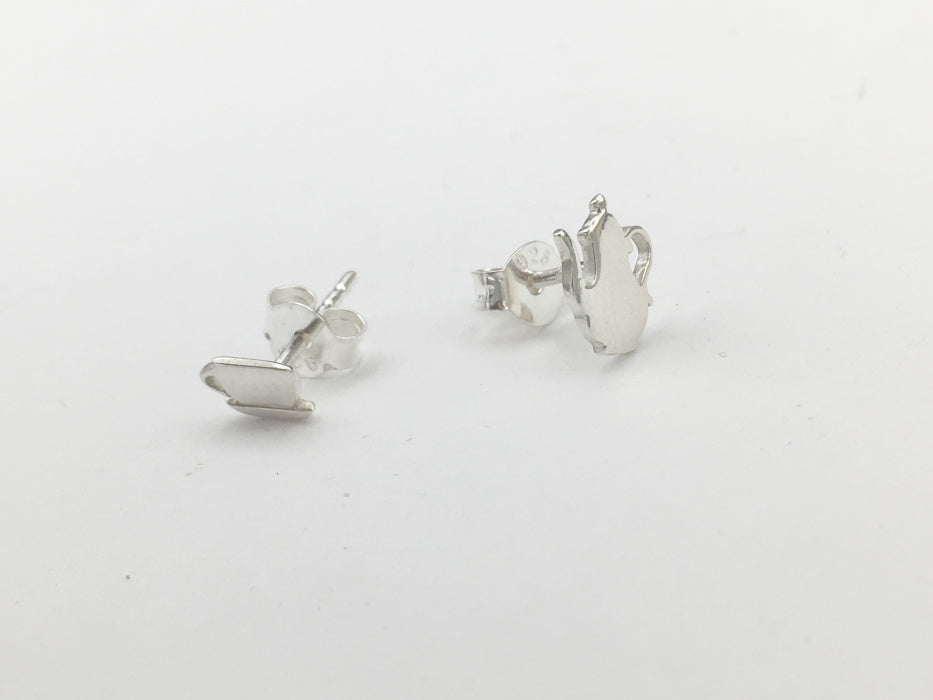 Sterling Silver tiny coffee pot and cup stud earrings, barista, tea, break,