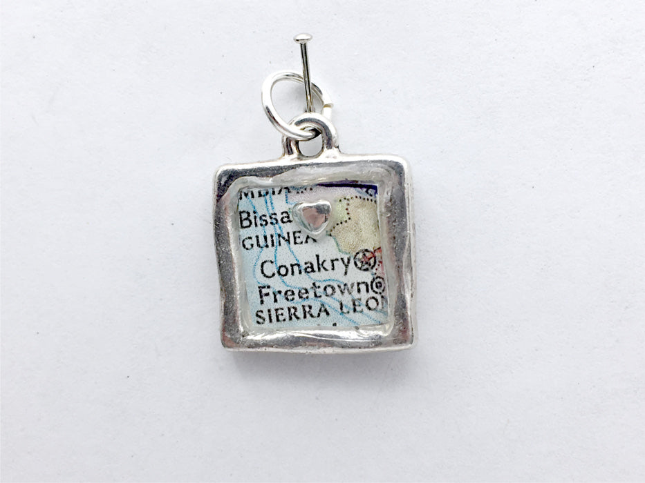 Square Pewter w/ Sterling Silver heart & Conakry, Guinea Map pendant, maps, West Africa