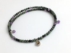 This is a gorgeous choker made on memory wire featuring faceted Kambaba Jasper and amethyst with a beautiful sterling silver and faceted amethyst centerpiece. Kambaba Jasper is said to be a stone of Peace and Tranquility- who couldn't use more of that!!! It fits a wide range of neck sizes, and measures approx 17 inches from end to end. No clasp, just put it on and go! Perfect for a night out or with a T-shirt- very versatile! One of a kind- so buy it today!