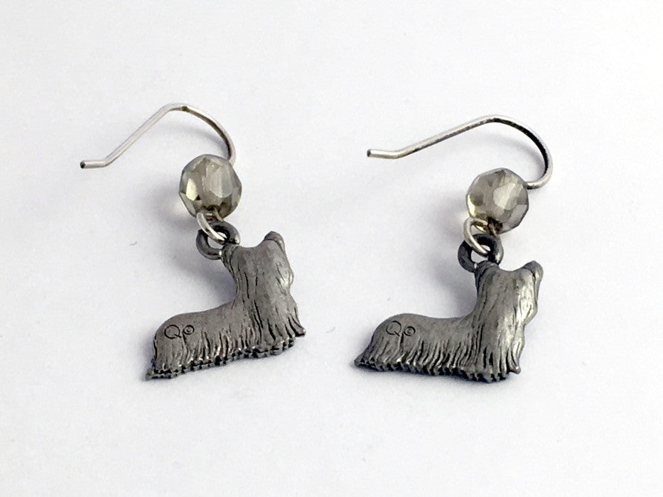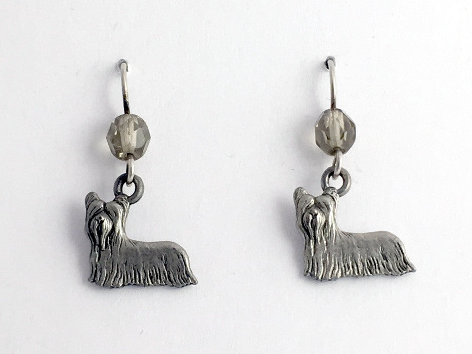 These sweet earrings are pewter Yorkie, Skye or Silky Terrier dogs . The charms are lead free pewter, cast in the USA. The earwires are sterling silver, shown here with a 6mm faceted grey glass bead. These measure approx. 1 3/8 in. long. Made in the USA.