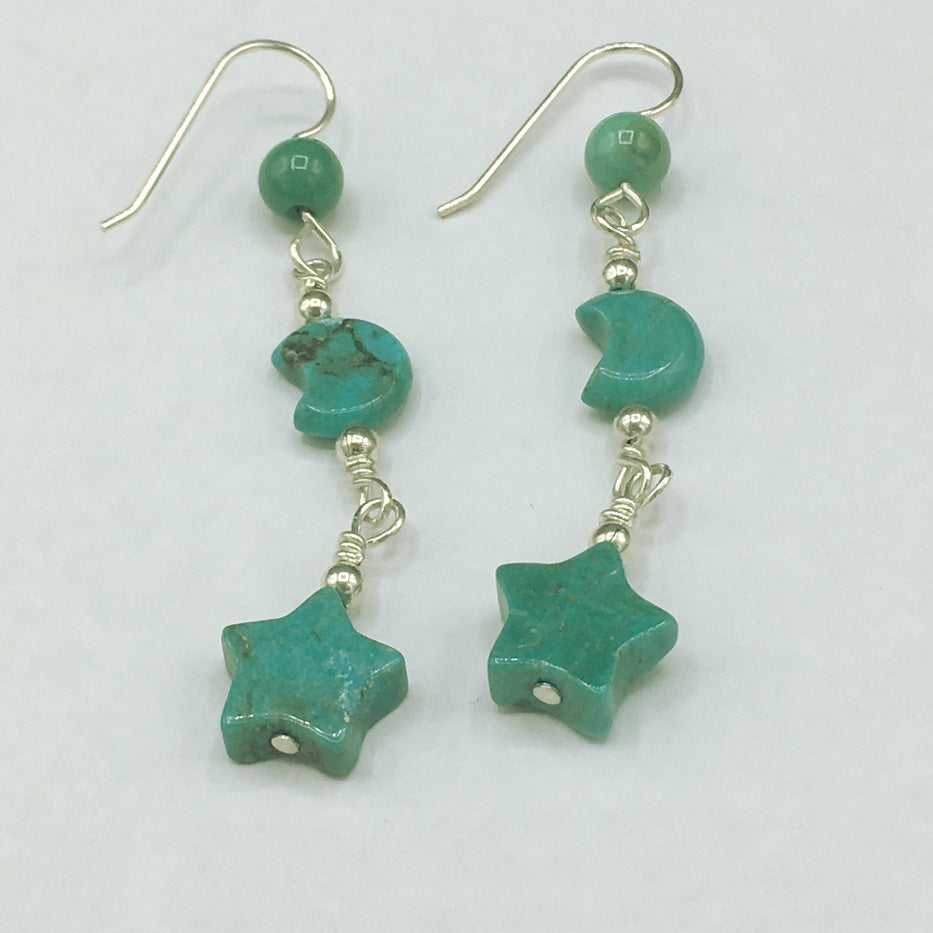 This is a gorgeous pair of Sterling Silver and Turquoise moon and star dangle earrings. All of the metal on this pair is Sterling Silver and the beads are turquoise. They measure approx. 2 3/8 inches long. A perfect gift for your favorite sky lover!